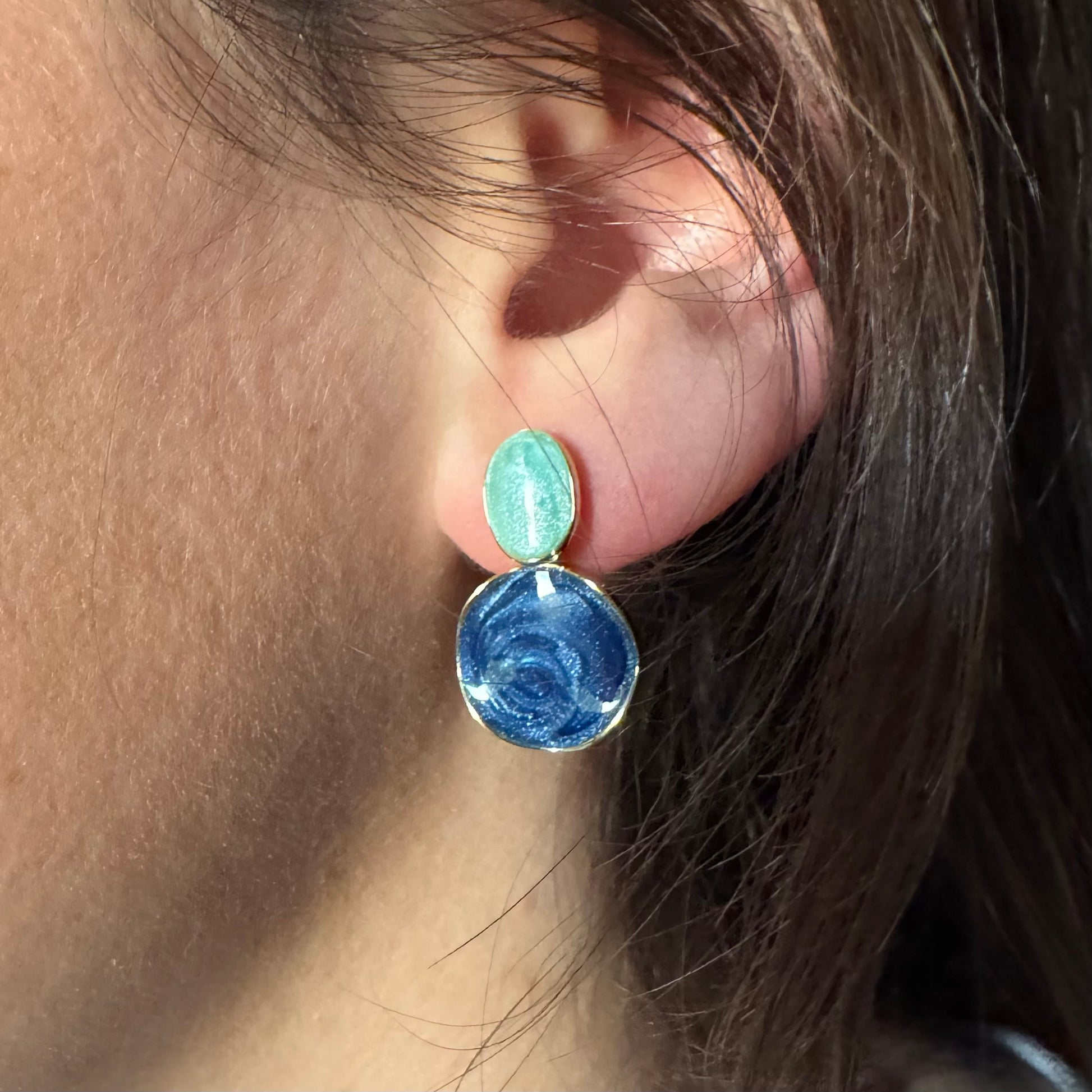 Aritos pequeños con dos tonos de azul hechos con piedra sintética de un acabado tipo piedra semipreciosa. Livianos y delicados, ideales para dar un toque de color sin recargar. Perfectos para combinar con jeans, blanco o cualquier look fresco 🌿