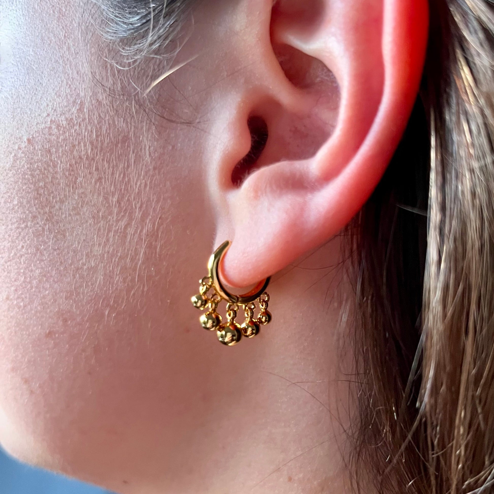 Delicadas argollas en acero dorado, de tamaño perfecto para cualquier ocasión. Cada aro lleva 5 pequeñas bolitas colgantes, que se mueven con elegancia y captan la luz al mínimo movimiento. Diseño versátil, combina con looks casuales y formales.