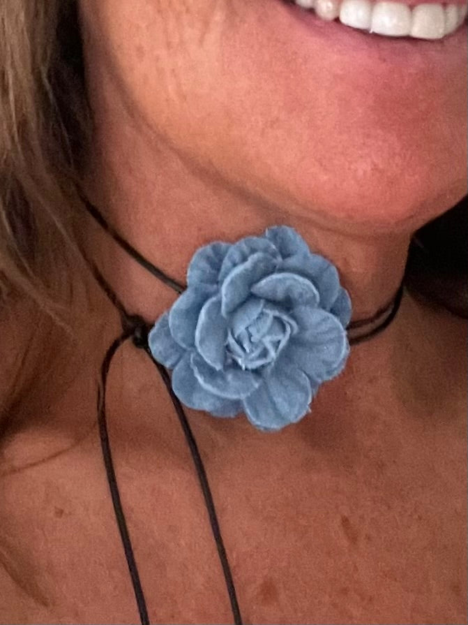 Maravilloso chocker celeste de mezclilla con cordón de cuero para lucir con todos tus outfits de esta temporada. Porte de la flor, 7 cms.
