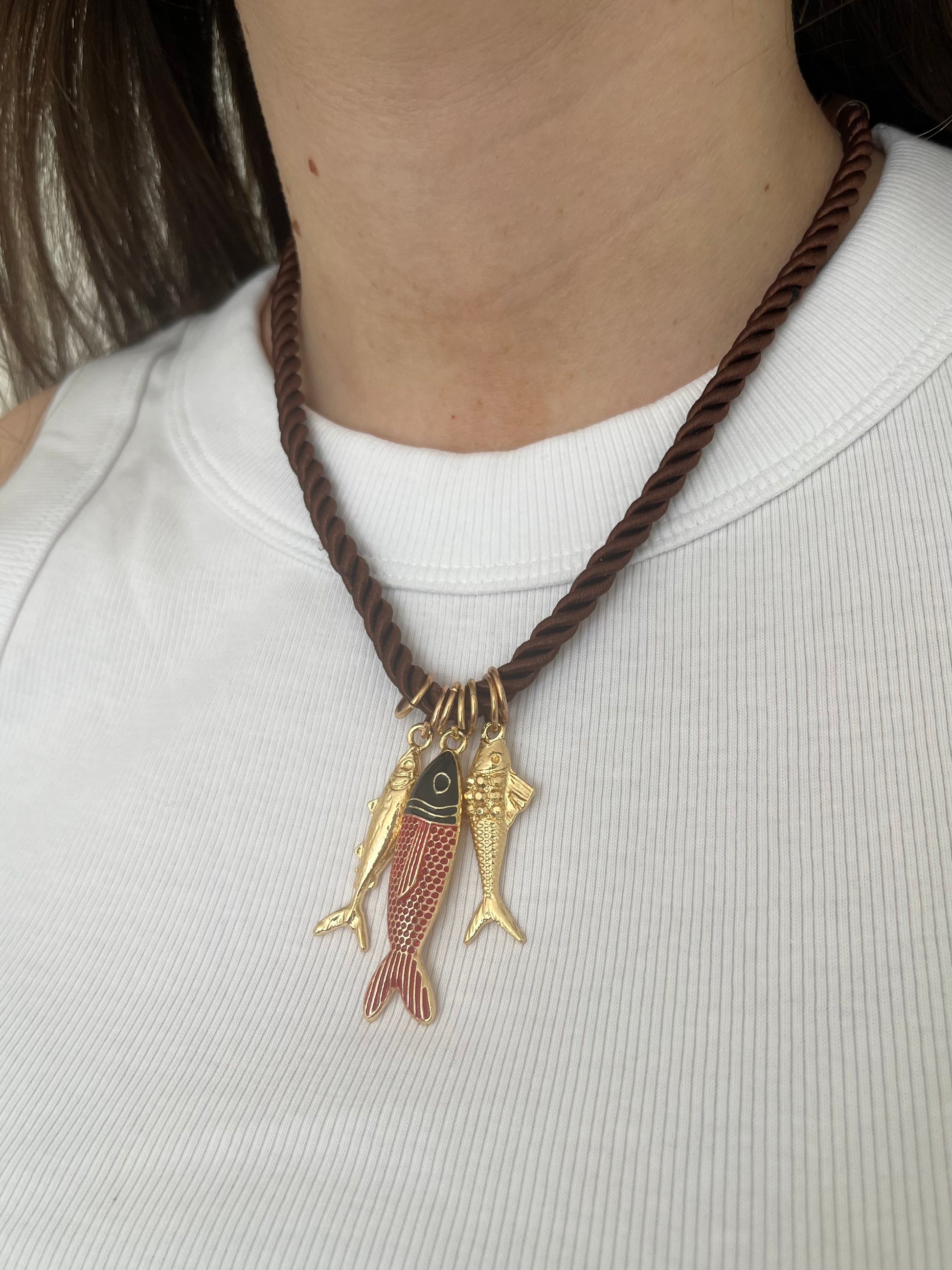 Collar de cordón café y colgantes de estilo naútico, dos pequeños pescados dorados y uno mas grande en el centro. Un accesorio fresco y original, ideal para dar un toque veraniego a cualquier look